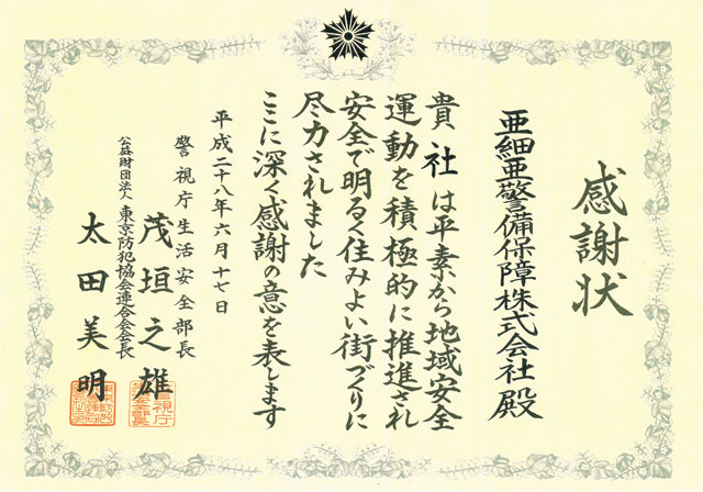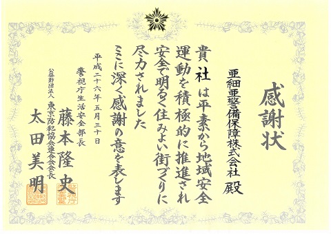 警視庁本庁より日頃の社会貢献に対して表彰されました。